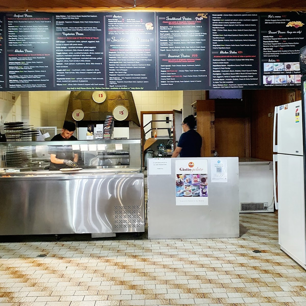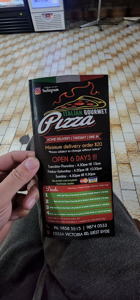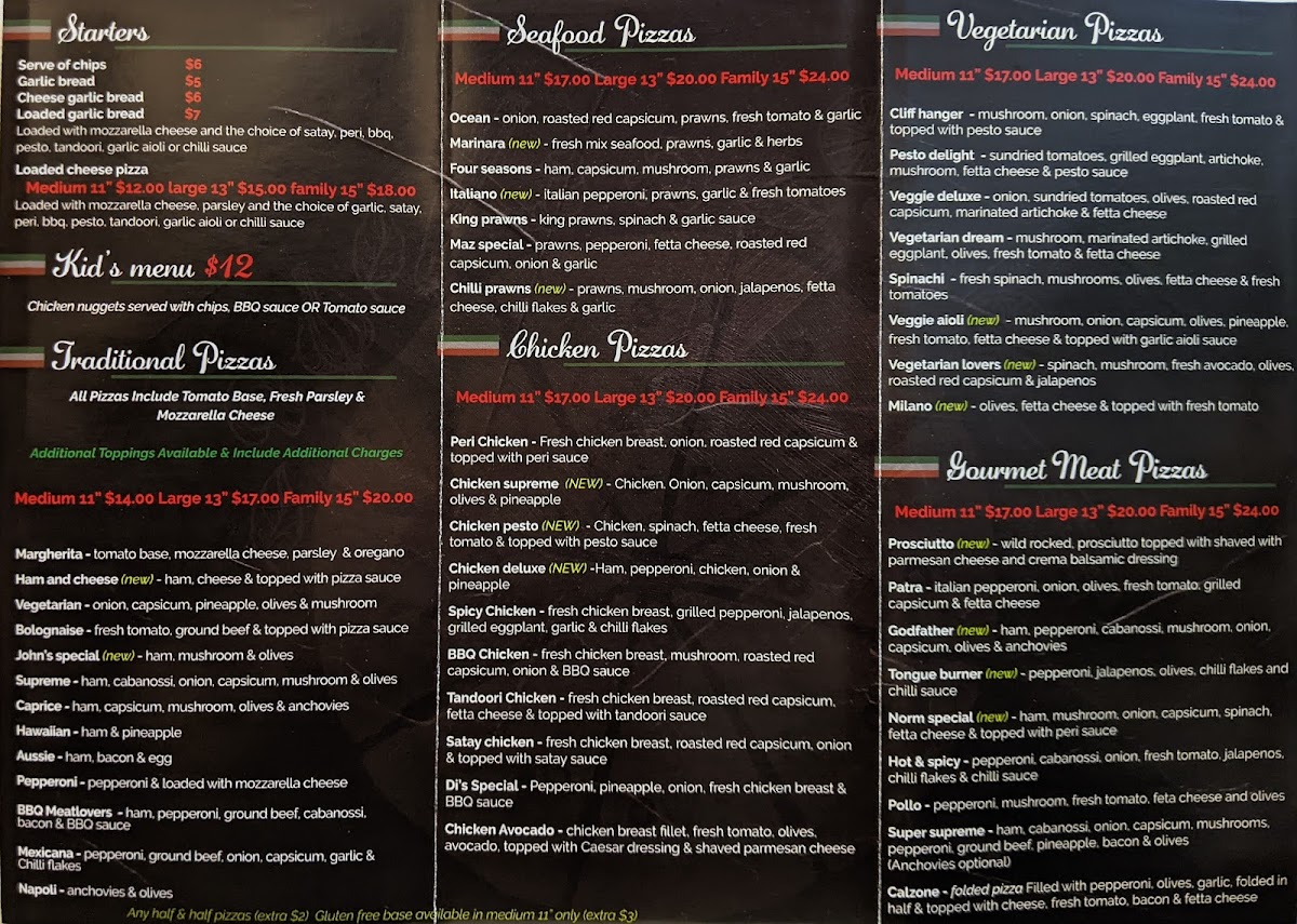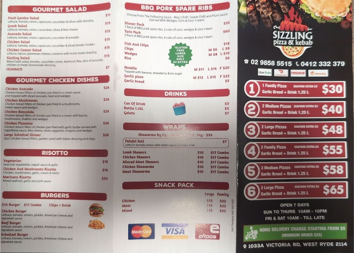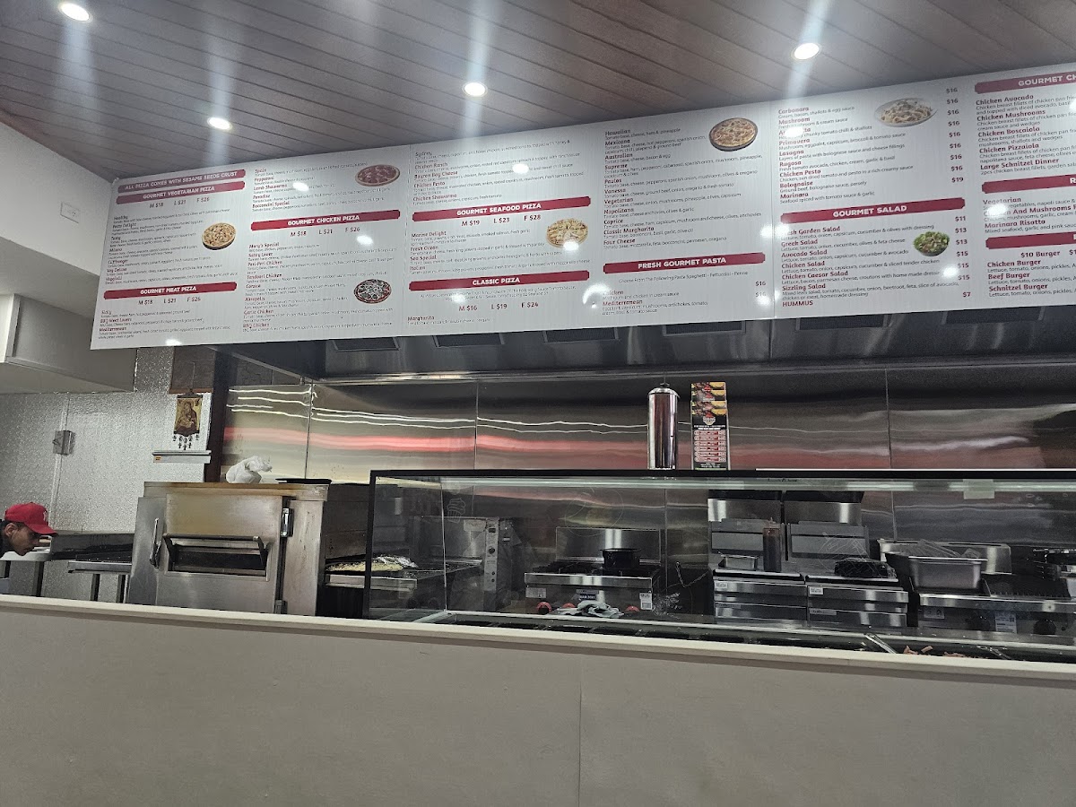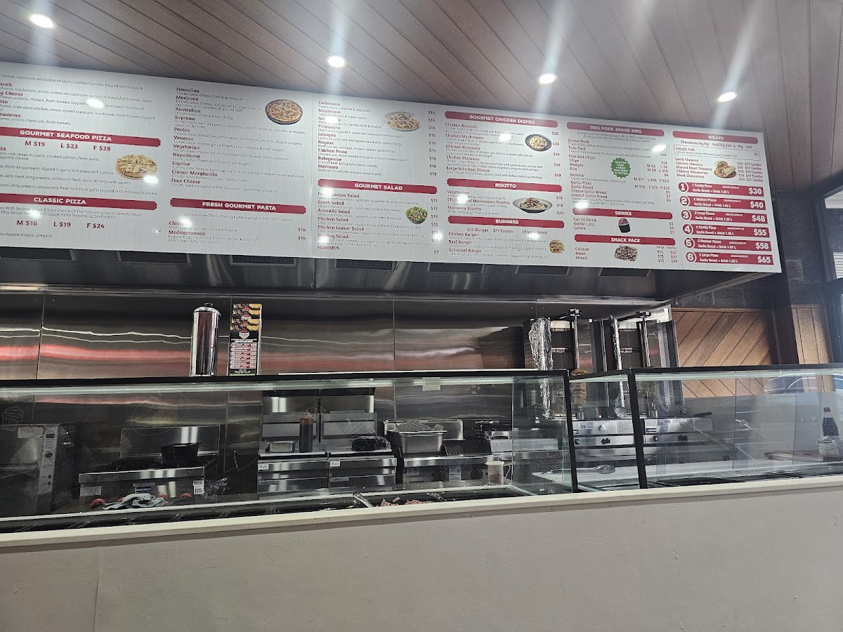From a reviewer’s perspective, the menu at Sizzling Pizza & Kebab offers a broad and satisfying mix that caters to a wide range of tastes, even though specific prices aren’t listed. The dessert option like Nutella Pizza adds a sweet finish, while the seafood selection-featuring Marinara Seafood Pizza (New) (Medium Gluten-Free), Chilli Prawns (New) (Medium Gluten-Free), Italiano (New Medium Gluten-Free), and Four Seasons (Medium Gluten-Free)-brings variety for seafood lovers. Classic comfort is covered with the kid-friendly Chicken Nuggets and flexible choices like Half 'N Half - Traditional Pizza (Medium), Large 19, and Family sizes. Pasta dishes such as Napolitana, Boscaiola - Traditional Pasta, and Arrabiatta Bolognese complement fresh sides like Rocket Salad (New), Caesar Salad (New), and Greek Salad. The pizza range is particularly strong, spanning Di's Special, Spicy Chicken (Medium Gluten-Free), and vegetarian options like Vegie Deluxe (Medium Gluten-Free) and Vegetarian Lovers (New) (Medium Gluten-Free). Starters including Loaded Cheese Pizza and Cheesy Garlic Bread round out the experience, while gourmet picks like Super Supreme, Norm Special (New), and Pollo (Gluten Free 12") elevate the menu further. With extras like Gelato options (Caramel Delight, Tartufo) and simple drinks, plus bundled Deals such as Deal 1 and Deal 5, the menu feels extensive and versatile, making it easy for diners to find something appealing regardless of their preference.